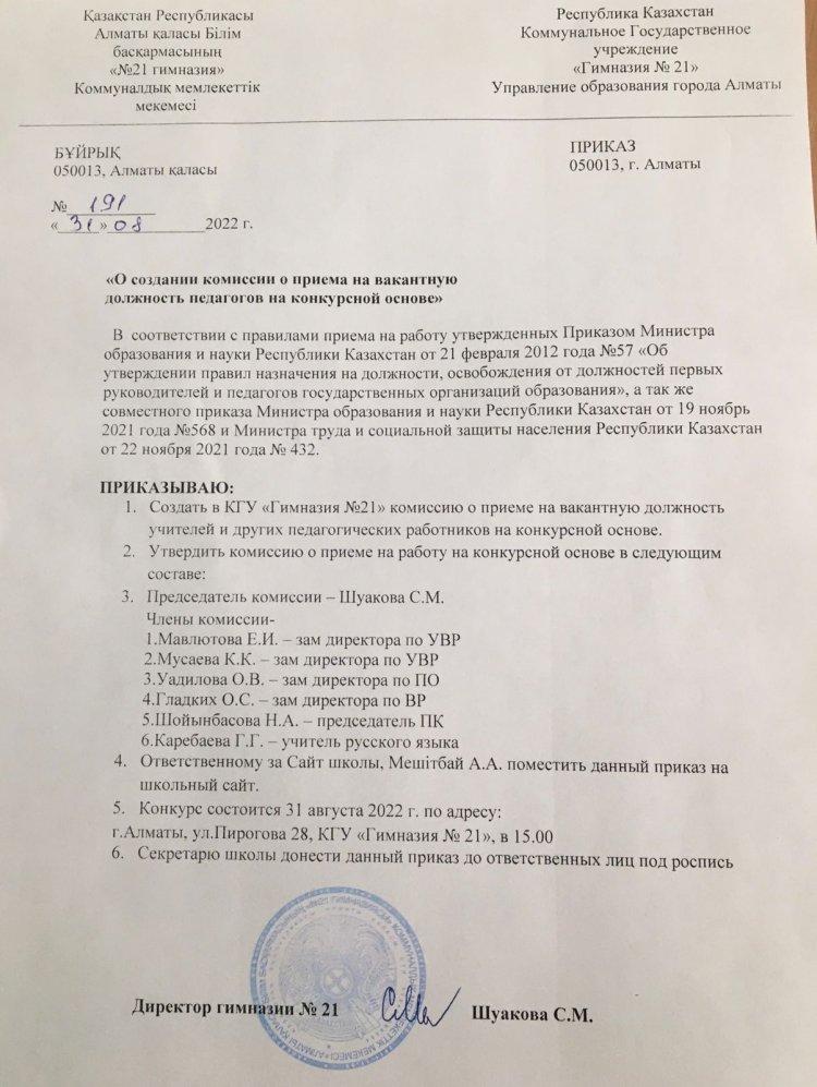 31 тамыз 2022 0 1 2 3 4 5 Приказ о создании комиссии о приема на вакантную должность педагогов на конкурсной основе